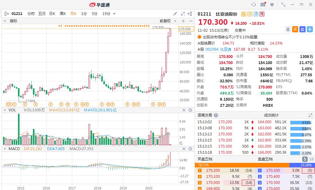 比亚迪股份今日股价再度刷出历史新高,目前大涨10.51%,股价突破170港元关口。A股比亚迪则收涨5.11%。