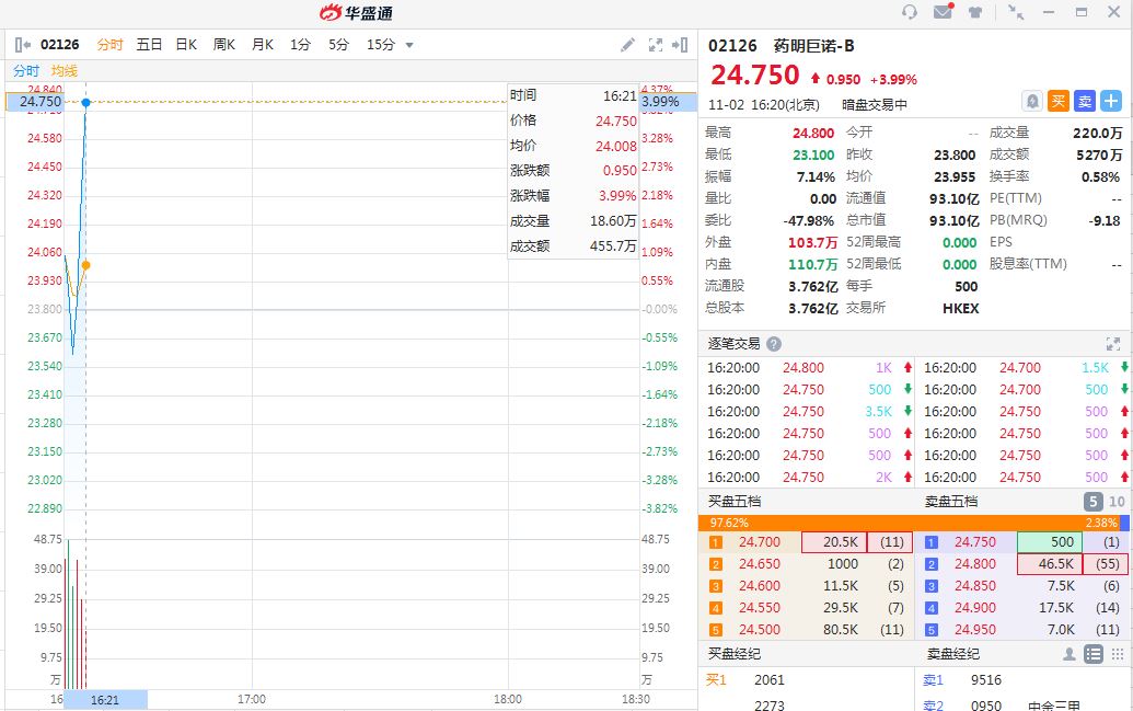 药明巨诺-B暗盘小幅上涨,目前涨3.99%,不计手续费,一手盈利475港元。