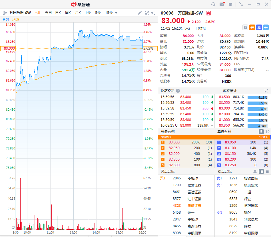 华盛资讯11月2日讯,万国数据-SW(09698.HK)收涨2.62%,报价83.0港元,全日最高价84.0港元,最低价81.0港元,最新总市值1221亿,一手盈利212港元。