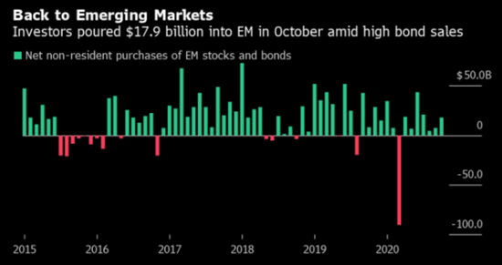 根据IIF的数据,10月份新兴市场股票获得63亿美元的非居民资金净流入,新兴市场债券获得117亿美元的净流入,这是继3月创纪录资金流出之后的第七个月资金净流入。