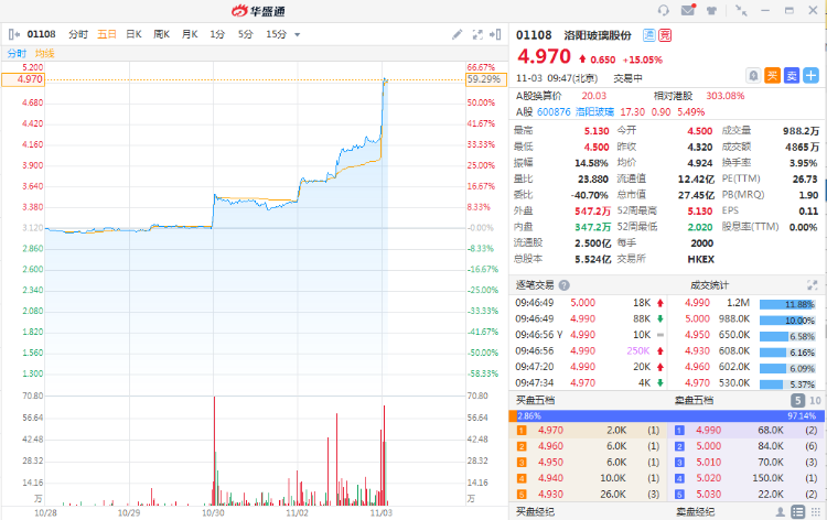 洛阳玻璃股份(01108)昨日大涨逾25%,今日早盘高开高走,截至发稿,涨15.05%,报4.97港元,成交额4865万港元。