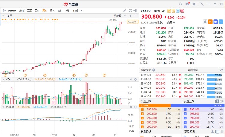 据悉,美团正在考虑最快明年在中国内地第二上市,公司股价午后直线拉升2%,股价突破300港元关口,创新高。