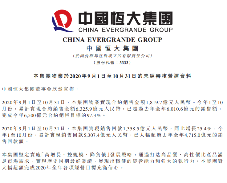 11月3日消息,中国恒大发布业绩公告,9-10月实现销售1819.7亿元,1-10月累计销售6325.9亿元,已超过去年全年6010.6亿元的销售额,完成6500亿年度目标的97.3%。9-10月恒大销售回款1358.5亿元,1-10月累计销售回款5307.4亿元,超过去年全年4715亿元的销售回款。