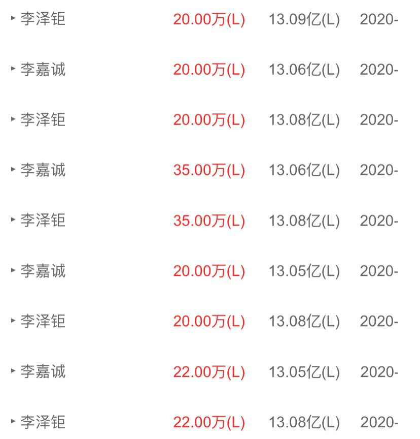 最近一次,李超人带着李泽钜在10月28日、10月29日、10月30日及11月2日,以约36港元股价继续购入长江实业集团共81万股,此次涉资共2931.79万元。增持完成后,李嘉诚持股比重由35.7%增至35.73%,而主席李泽钜的持股比重则由35.77%增至35.79%。