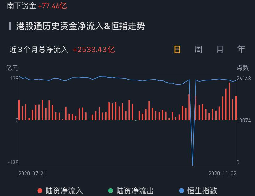 南下资金今日净流入港股77.46亿港元,与昨日相比略微增加2亿多港元。