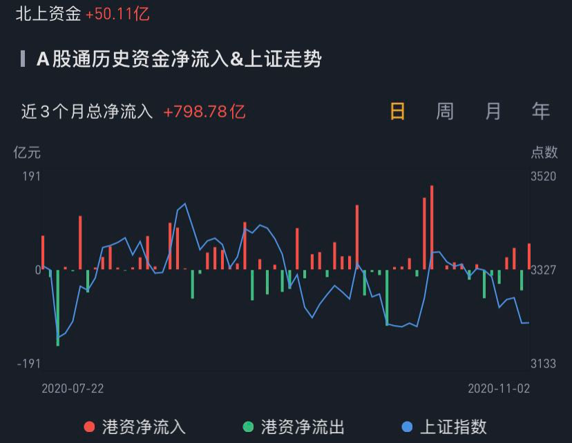 北上资金今日净流入A股50.11亿元,与昨日相比基本持平。