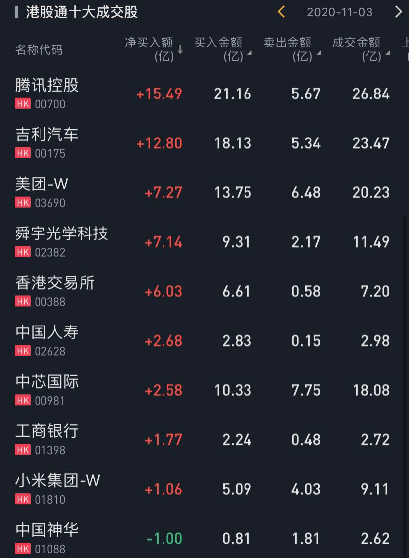 个股方面,今日南下资金净买入腾讯控股15.49亿港元。此外,南下资金还净买入吉利汽车12.80亿港元,净买入美团-W7.27亿港元,净买入舜宇光学科技7.14亿港元。