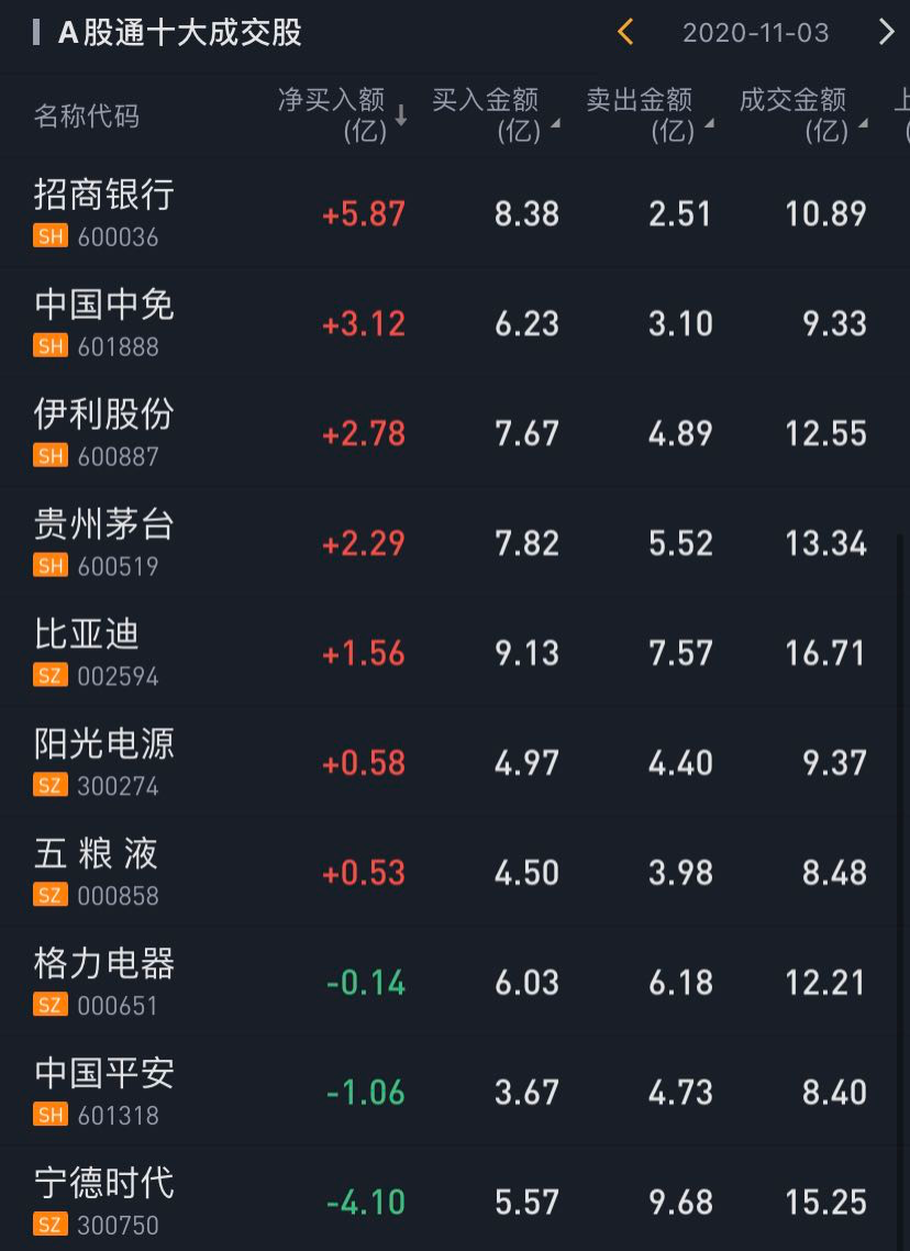 北上资金今日净买入招商银行5.87亿元,净买入中国中免3.12亿元,净买入伊利股份2.78亿元;净卖出宁德时代4.10亿元。