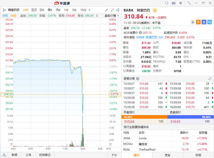 阿里巴巴美股盘前快速跳水,一度跌逾6%。