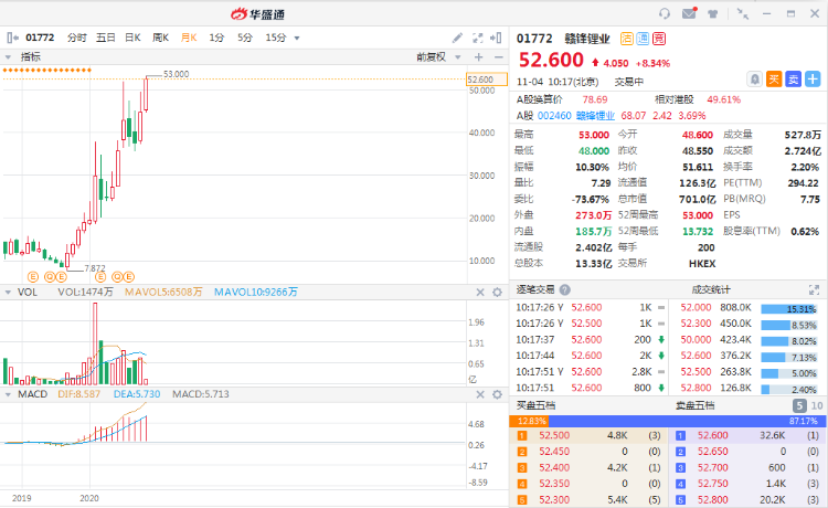 截至发稿,赣锋锂业涨8.34%,报52.6港元,成交额2.724亿港元。