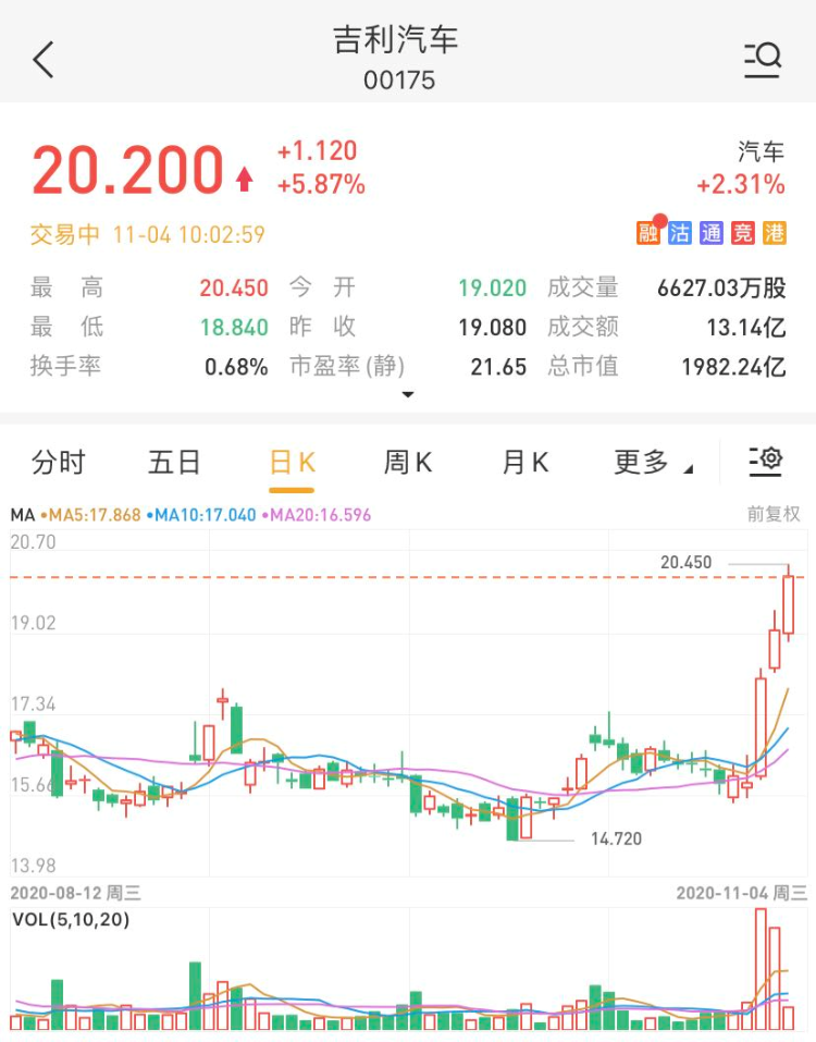 报告称,受公司5款新产品周期带动,花旗上调其未来3年销量预测。另吉利与富豪汽车合并计划除了减省成本,或将引入领克品牌的股份,该行相信会大幅推升吉利2021年纯利至170亿元人民币水平。而且未来2年旗下纯电汽车PMA架构市值可达约3140亿元人币,相当于股价水平30港元。