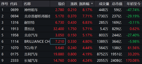 汽车股持续爆发:神州租车涨超8% 华晨中国涨近5%