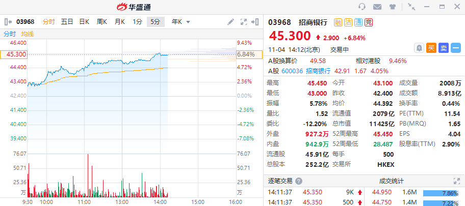 招商银行午后持续走高,最高见45.45港元,现涨至6.84%,成交量超2000万。