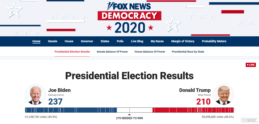 另据美国福克斯新闻实时统计,截至目前,拜登已拿下237张选举人票,特朗普拿下了210张。