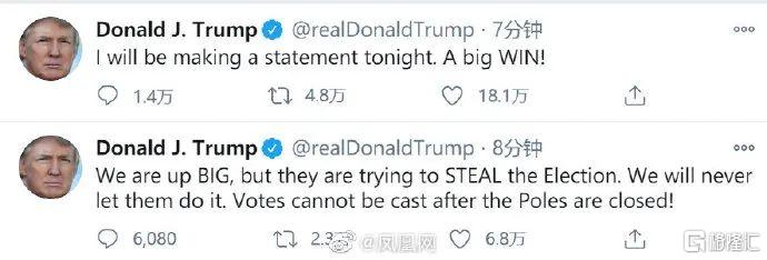 另据凤凰网报道,特朗普也发推表示,“我今晚要发表一个声明。(有)一个重大胜利!”