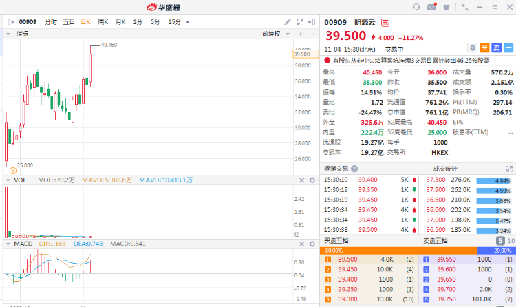 截至发稿,明源云涨11.27%,报39.5港元,成交额2.151亿港元。
