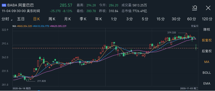 本次阿里发布财报的时机相当敏感,一边是美国大选将公布结果,一边是蚂蚁集团AH两地上市遭监管叫停,而蚂蚁暂缓上市事件更是直接导致阿里股价暴跌。