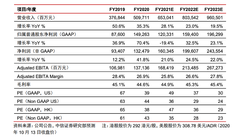 盈利预测及投资建议方面,中信证券分析师维持阿里巴巴2021~2023财年收入预测6530亿/8035亿元/9605亿元,同比+28%/+23%/+20%,维持净利润(非 GAAP)预测1603亿/1996 亿/2436亿元,同比+21%/+25%/+22%,现价对应市盈率为36x/29x/24x。