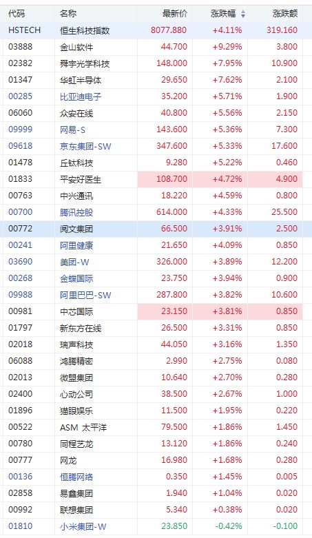 金山软件涨超9%,领涨指数成分股。华虹半导体、舜宇光学涨超7%,比亚迪电子、网易、丘钛科技涨5%。