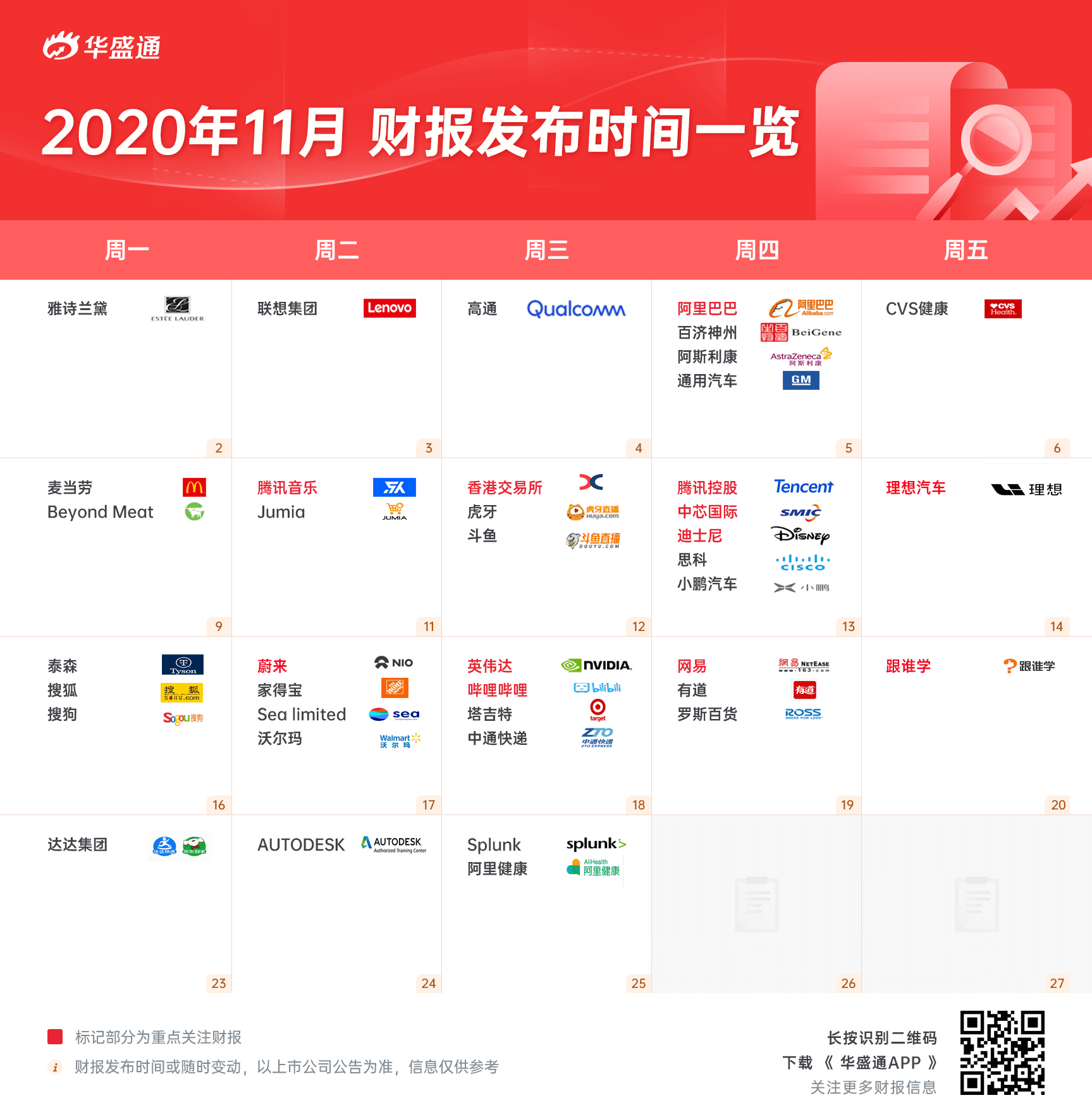 11月值得重点关注的财报有阿里巴巴(11月5日)、腾讯控股(11月13日)、中芯国际(11月13日)、小鹏汽车(11月13日)、理想汽车(11月14日)、蔚来(11月17日)、网易(11月19日)、跟谁学(11月20日)等。