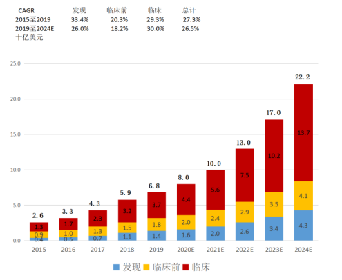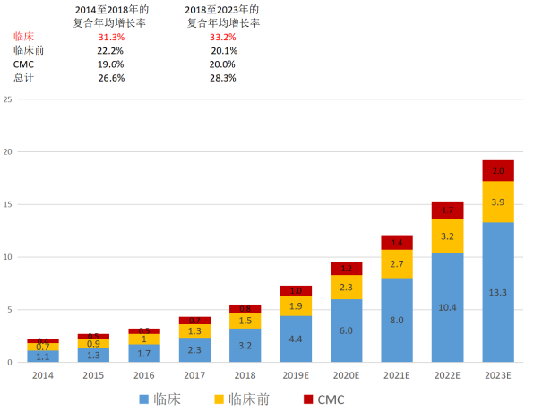 根据弗若斯特沙利文,预计到2023年中国CRO市场规模将增至191亿美元,从2018年至2023年期间的CAGR(年复合增长率)为28.3%。