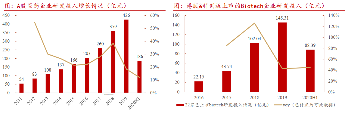 比如统计18家港股以及4家科创板制药类Biotech公司,其2020年上半年合计研发投入为88.4亿元,特别增长44.9%,继续呈现超高速增长。而统计这些重点生物制药公司研发外包的占比可以发现,2016年至2019年外包占比为40%-50%,呈现一定的上升趋势。
