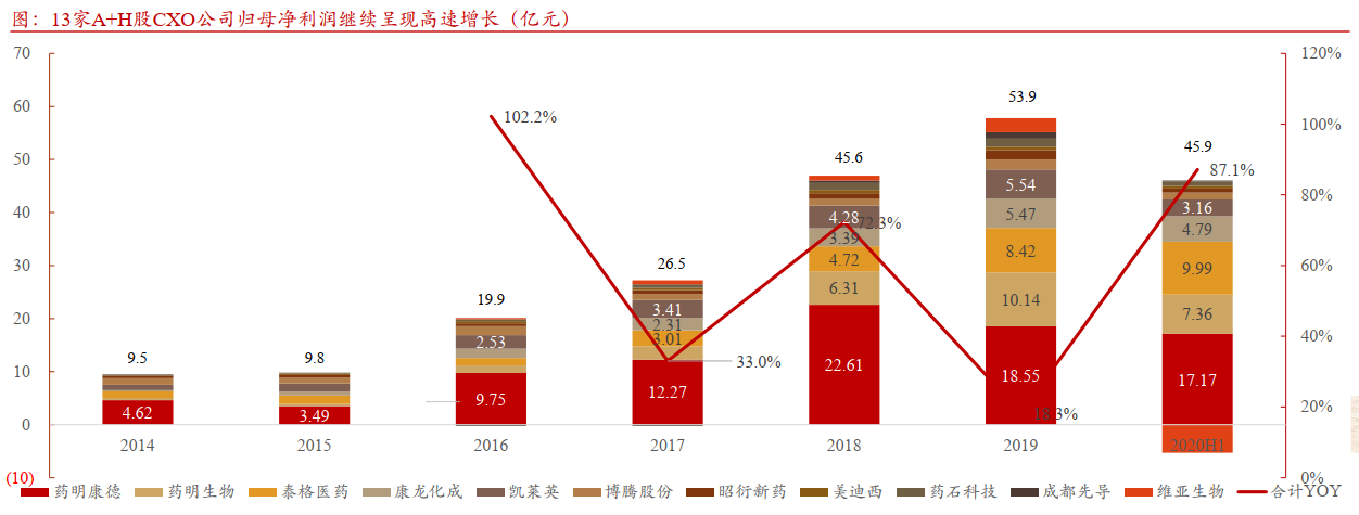在2020年上半年,13家A+H股中的CXO公司(包含CRO和CMO)合计实现营收173.8亿元,同比增长25.7%;实现归母净利润45.9亿元,同比增长87.1%。其中药明康德、药明生物、泰格医药、康龙化成、凯莱英、博腾股份、昭衍新药、药石科技均实现了超高速增长。