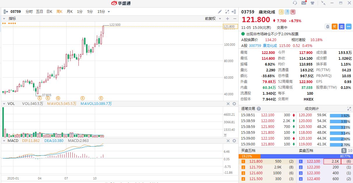 比如布局全流程一体化医药研发业务的企业康龙化成,其在11月5日股价一度触及121.5港元历史高位,截至目前2020年最大累计涨幅超过219.7%。