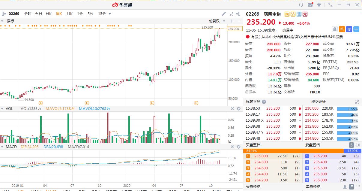 另外一家生物制药服务商药明生物,在11月5日股价也同样“破顶”,股价一度涨至234.6港元历史高位,截至目前2020年累计最大涨幅高达137%。
