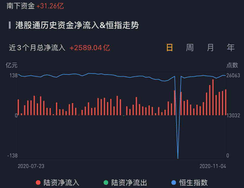 南下资金今日净流入港股31.26亿港元,资金流入规模环比大幅缩小。