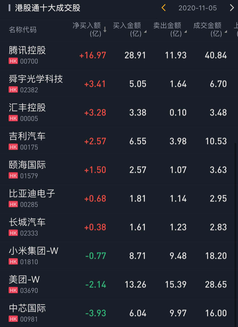 个股方面,今日南下资金净买入腾讯控股16.97亿港元。此外,南下资金还净买入舜宇光学科技3.41亿港元,净买入汇丰控股3.28亿港元,净买入吉利汽车2.57亿港元。