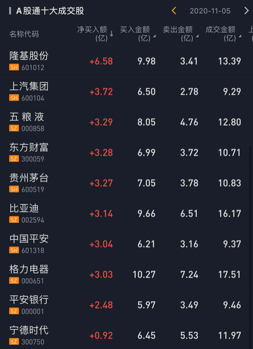 北上资金今日净买入隆基股份6.58亿元,净买入上汽集团3.72亿元,净买入五粮液3.29亿元,净买入东方财富3.28亿元。