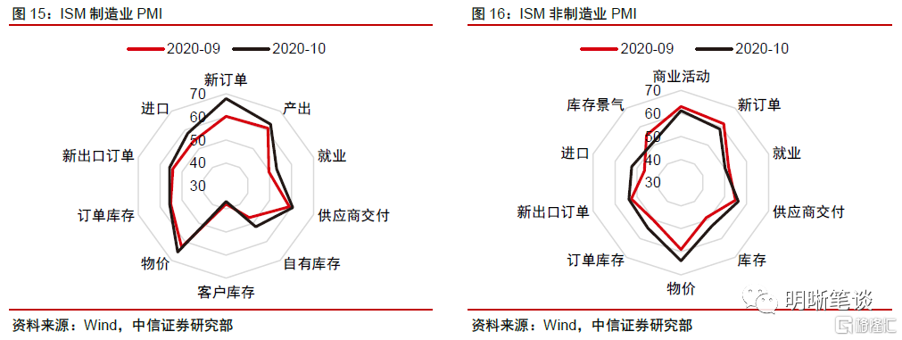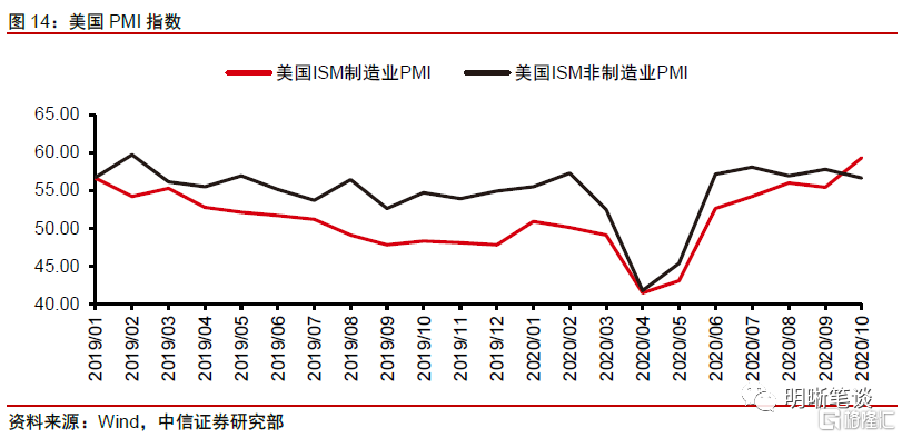 经济景气方面,美国10月制造业PMI指数大幅超出市场预期,录得2018年11月以来新高,反映制造业活动的明显改善,但非制造业PMI指数略不及预期和前值,反映出美国疫情反复对于非制造业的影响。美国10月ISM制造业PMI为59.3,前值55.4,制造月PMI表现超出市场预期升至2018年11月以来的最高水平;非制造业PMI为56.6,前值57.8,预期57.5。PMI指数反映出当前美国经济处于复苏阶段,制造业活动改善明显。具体而言,制造业方面,PMI新订单指数为67.9,前值60.2,新订单激增有力拉动了制造业PMI上扬,PMI就业指数录得53.2,自2019年7月以来首次回到荣枯线上方,符合美国就业市场改善的整体趋势。但非制造业方面,10月美国非制造业PMI报56.6,相较前值57.8小幅下行,近期美国疫情的反复或对非制造业产生一定的影响,放缓了非制造业的改善进程。