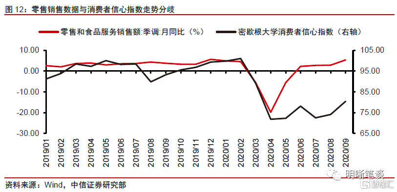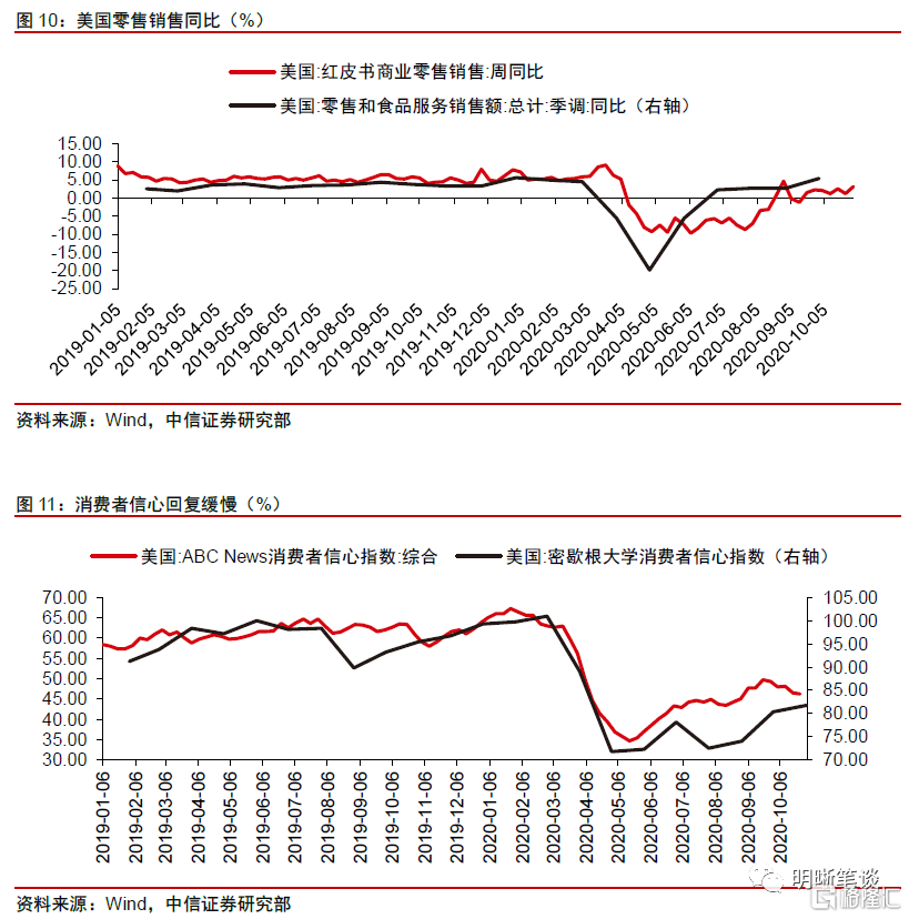 消费方面,在基本面经历过二季度的强烈冲击、出行限制逐渐解除之后,美国消费需求有所释放,消费逐步回暖,但消费者信心指数显示消费者支出意愿难言强烈。一方面,随着美国推进经济重启、防疫政策放松,前期被抑制的消费需求出现集中释放,美国红皮书商业零售销售周同比和美国零售和食品服务销售额月同比显示出美国消费的反弹迹象:从同比增速上看,红皮书商业零售销售周同比已恢复至接近疫情前水平,9月美国零售和食品服务销售额月同比录得5.36%,已高于2020年疫情爆发前的水平。但从消费者信心的情况来看,美国居民对于消费的预期仍旧较为谨慎:根据密歇根大学公布的月频数据和ABC News统计的周频数据,当前美国消费者信心指数虽处于缓慢回升的过程中,但远低于疫情前水平。结合美国零售销售同比和消费者信心指数走势,虽然在经济重启后美国零售数据出现了快速的反弹,但消费者信心指数回复明显较为缓慢,消费者对于未来的预期仍旧倾向谨慎,支出意愿难言强烈。