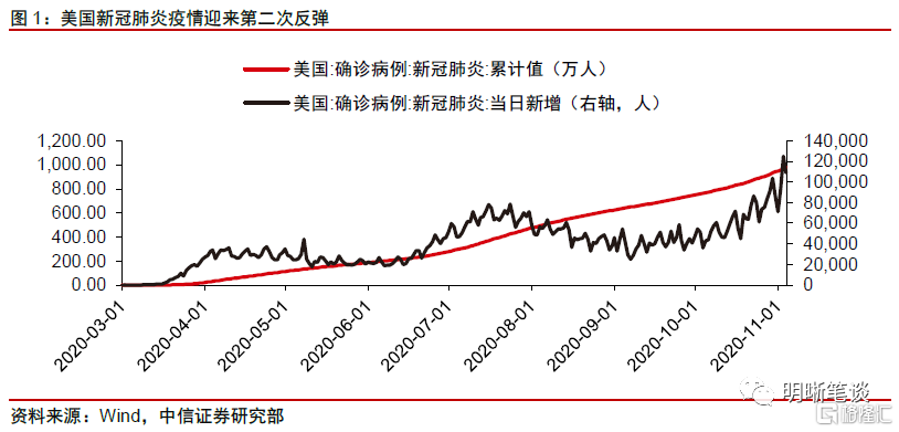 疫情方面,目前美国疫情仍未得到有效控制,且近期疫情出现恶化,从疫苗研发进展来看,目前距离新冠疫苗大规模充分利用仍需一段时间。3月份美国经受了第一轮全球疫情扩散的冲击,疫情人数快速增加,4月份美国疫情进入平台期,5月底随着经济重启工作的推动,6月下旬美国疫情迎来了第一次反弹,7月拐点出现后每日新增人数开始下降,但进入9月美国疫情又遭受了第二次反弹。2020年11月3日,美国每日新增确诊人数再创新高,录得124985人,累计确诊人数达969万人。根据美国《纽约时报》发布的Coronavirus Vaccine Tracker专栏,目前进入第三阶段测试的美国疫苗公司共有四家,分别是Moderna、辉瑞、Novavax以及强生公司,但由于疫苗在最终投入大规模使用前仍要经过充分的测试与论证,因此目前距离新冠疫苗大规模充分利用仍需一段时间。
