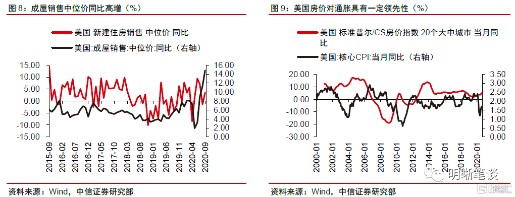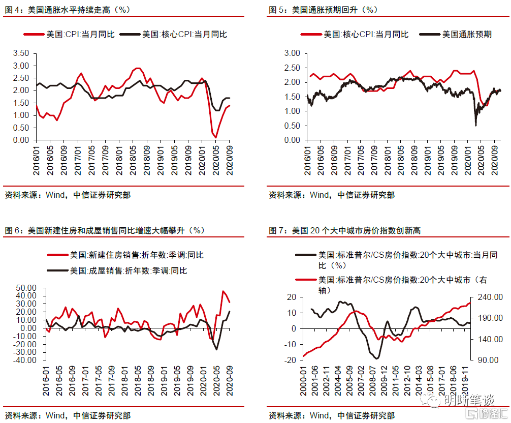 通胀方面,疫情后美国通胀水平持续走高,通胀预期明显回升,同时受货币宽松政策影响,美国房地产市场景气度明显上升。3月份美国通胀预期在疫情冲击下快速下滑,然而在美国财政和货币政策的持续刺激下,目前美国通胀水平持续走高,9月美国CPI同比为1.4%,前值1.3%,为连续第4个月上升。通胀预期也出现了明显回升,较3月的低位增加逾1%。伴随着美联储货币政策的大幅宽松,美国房地产市场同样表现抢眼,目前美国房地产行业景气程度已超过经济危机前期高点水平。从美国房地产市场销售和房价情况来看,疫情后美国新建住房和成屋销售同比增速均出现大幅攀升,20个大中城市房价指数和成屋销售价格的同比增速明显升高,美国房市成交火热。从新建住宅获批和开工情况来看,新建住宅获批数量已恢复至疫情前水平,开工数量同样回升至高位。