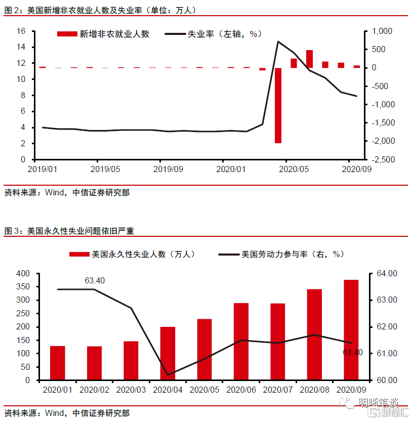 就业方面,9月份美国新增非农就业人数少于一百万人,显著低于市场预期和前值,数据显示近几月来美国就业市场改善放缓的趋势仍在延续,永久性失业问题依旧严重,政策刺激减弱的背景下需关注企业破产与裁员情况。美国9月季调后新增非农就业人口66.1万人,显著低于市场预期85万人和前值137.1万人;失业率为7.9%,预期为8.2%,前值为8.4%。就业数据显示虽然近几个月来美国就业持续改善,但改善逐渐放缓的趋势也十分显著。分行业来看,9月新增非农就业人数的增长主要来源于休闲和酒店业、零售业以及专业和商业服务行业,同时在预算削减等因素影响下政府部门就业大幅减少。9月美国劳动力参与率为61.4%,相较疫情爆发前下降了2个百分点,表明疫情爆发后大量劳动力人口淡出了美国市场;美国9月份永久性失业人数录得375.6万人,环比增长超10%,显示永久性失业情况加剧的结构性问题依旧严重。新一轮财政刺激法案的落地被推迟到大选结束之后,美国企业、特别是中小企业面临的情况越发严峻,9月美国挑战者企业裁员人数报11.9万人,企业裁员人数在8月出现下降后又再次有所提升,若中小企业破产速度加快,或将使美国失业风险再度升温。