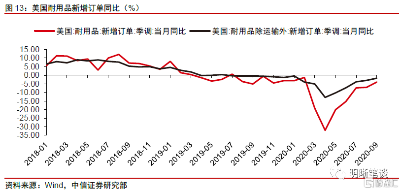 投资方面,美国耐用品新增订单环比连续六个月增长,耐用品新增订单当月同比降幅继续收窄。美国9月耐用品新增订单规模录得2374亿美元,为疫情爆发以来最高值,但尚未恢复到疫情前水平,9月耐用品新增订单当月同比降3.92%,前值降7.10%,除运输外9月美国耐用品订单当月同比下降1.68%,前值将3.05%。美国耐用品新增订单同比降幅有所收窄,反映美国投资状况逐渐回暖。