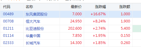 其他车企方面,东风集团大涨16%,比亚迪股份涨超2%、华晨中国、长城汽车涨超1%。
