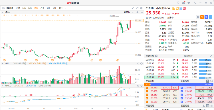 小米集团短线上扬,大涨4.54%领涨蓝筹,市值站上6000亿港元,最新市值6117亿港元。公司双11销售业绩亮眼,第三季度在西欧手机市场翻倍增长进入前三名。