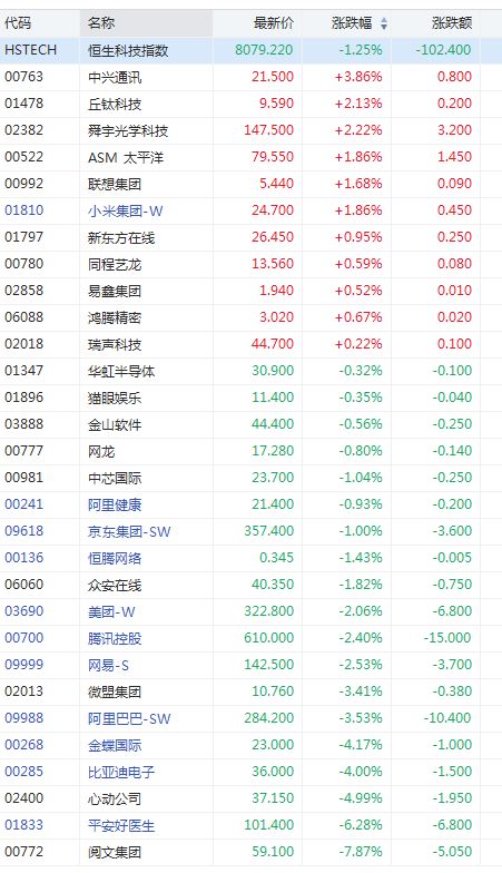 京东跌1%,美团、腾讯跌超2%,阿里跌超3%。