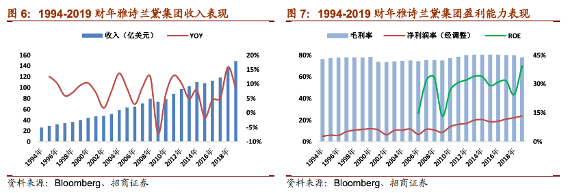 1994-2019年间,雅诗兰黛集团实现了惊人的业绩增长。25年间,雅诗兰黛的营业收入从25.76亿美元增长至148.66亿美元,净利润率从区区2.7%提升至13.3%,而衡量资本利用效率的核心指标ROE则长期保持在30%的高位。