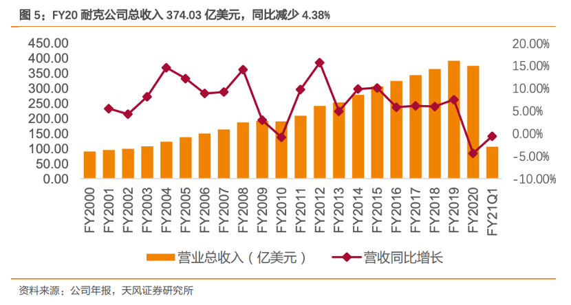 耐克公司历年业绩稳健增长,营业收入从2000年的不足100亿美元增至2020年超过350亿美元。今年,由于全球新冠疫情爆发,耐克营收增速有所放缓,但长期来看公司的竞争力仍然无损。