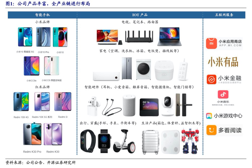 小米集团产品丰富,全产业链进行布局。公司主营业务包括智能手机、IoT 与生活消费产品、互联网服务以及其他业务。其中,公司的智能手机业务分为小米和红米两大品牌,其中小米致力于向高端旗舰转型,红米则延续先前的极致性价比战略。