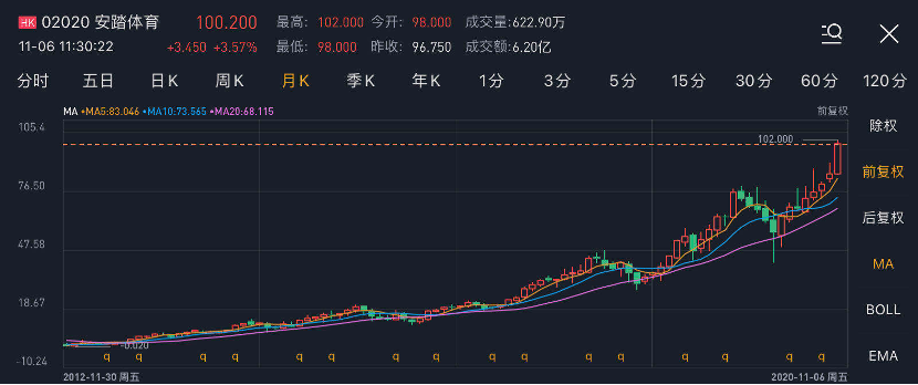 在资本市场,安踏也为投资者带来丰厚回报。截止2020年11月6日午盘收盘,安踏首次站上100港元大关,自2010年以来累计回报超过1000%!