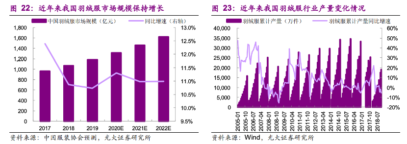 此外,波司登所处的行业前景展望也较为稳定。据中国服装协会羽绒专业委员会数据显示,2018年中国羽绒服市场规模达1068亿元,同增10.86%,预计2022年中国羽绒服市场规模超过1600亿元,同比增长11.0%。受居民收入持续增长、羽绒服产品渗透率提升影响,羽绒服行业销售收入增长较为稳定。