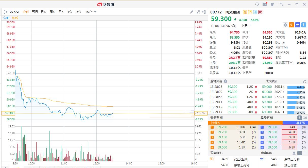 阅文集团(00772.HK)今日股价高开低走,盘中一路下跌,最低点跌破8%。目前跌7.56%。报59.3港元,成交额达3.687亿。