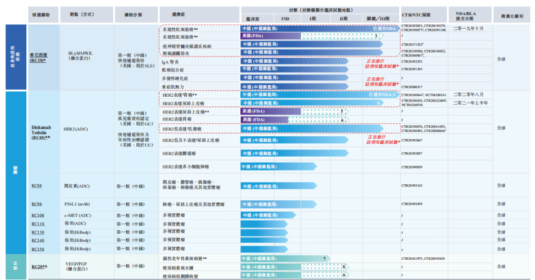 从目前的产品线看,公司的产品储备一般,进入1期以后的药物分别为泰它西普,RC48和RC28。