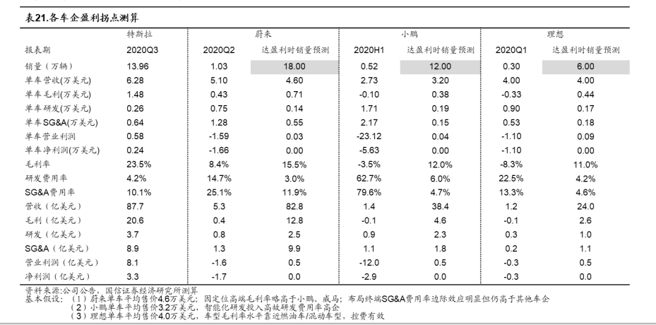 盈利拐点:与传统车相比,造车新势力具“重研发+重销售体系”特征,对应研发费用率(以小鹏为代表)及SG&A费用率(以蔚来为代表)高企。在假设下,测算得蔚来/小鹏/理想分别为18/12/6万辆时盈利。