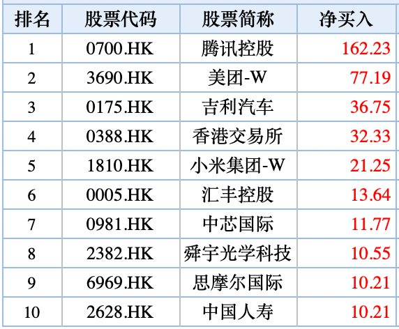 个股资金流向统计:南下资金重点加仓腾讯、美团、吉利汽车